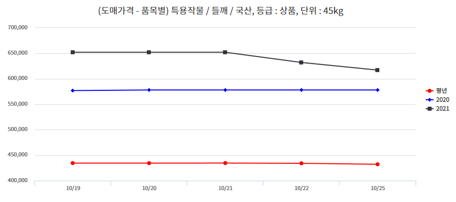 한국농수산식품유통공사에 들어가면 들깨 가격을 살펴볼 수 있습니다. 해당 자료를 보면 2021년 들깨 가격은 평년에 비해서 아주 많이 오른 상태라는 것을 확인할 수 있어요.