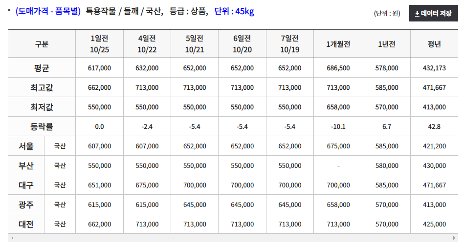 10월 중순 기준으로 45kg에 65만원 정도였으니, 6kg으로 따지면 8만6700원 정도, 1kg으로는 1만4400원 정도 된다고 생각하면 됩니다. 도매가 기준으로 된 무게를 나눈 것이어서 소매가로 따지면 이것보다 더 올라가겠죠. 들깨 시세를 잘 확인하려면 이렇게 도매가를 알아두는 것도 좋습니다.